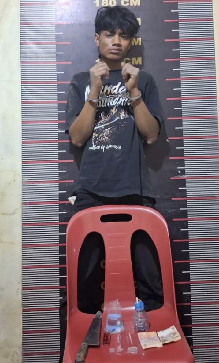 Dari hasil pemeriksaan di tempat, petugas menemukan sejumlah barang bukti berupa sebilah pisau yang disimpan di tubuh yang bersangkutan, dua alat hisap sabu (bong) di saku celana belakang sebelah kanan, tiga kaca pirex, satu buah mancis warna merah, serta uang tunai sebesar Rp10.000 di saku celana depan sebelah kanan.