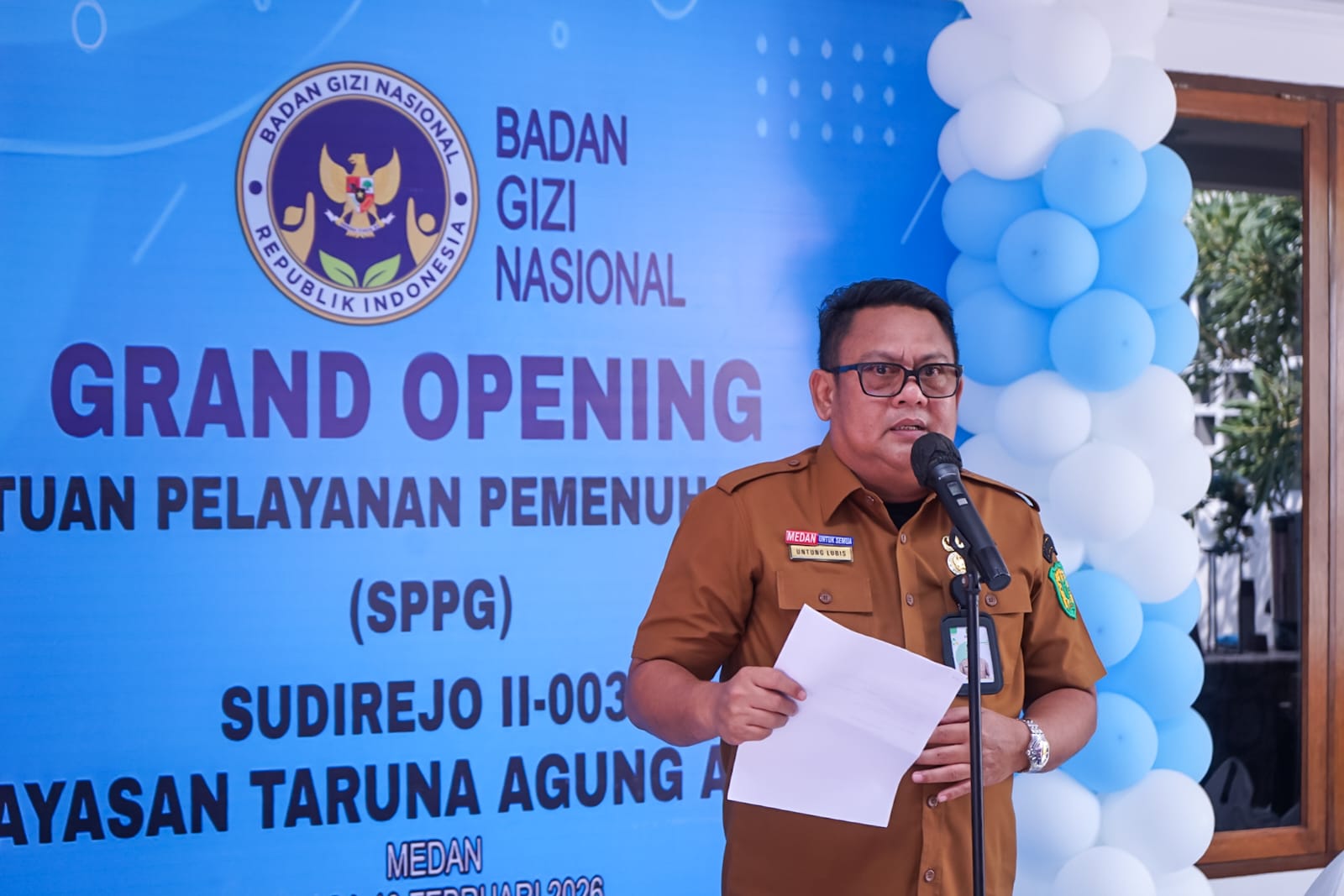 Hal tersebut disampaikan oleh Plt Kepala Dinas Ketahanan Pangan, Pertanian dan Perikanan (DKP3) Kota Medan Ahmad Untung Lubis ketika membacakan sambutan tertulis Wali Kota Medan Rico Tri Putra Bayu Waas dalam acara Grand Opening Satuan Pelayanan Pemenuhan Gizi (SPPG) Sudirejo II-003 milik Yayasan Taruna Agung Abadi, di jalan Kemiri III, Kec. Medan Kota, Selasa (10/02/2026).